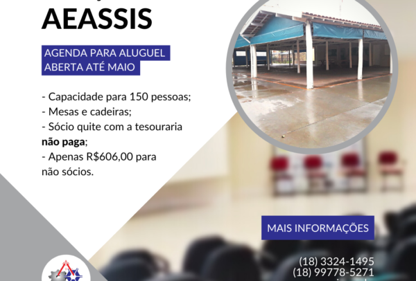 A agenda para aluguel do Espaço AEASSIS está aberta até maio! Lembrando que sócios quites com a tesouraria não pagam!